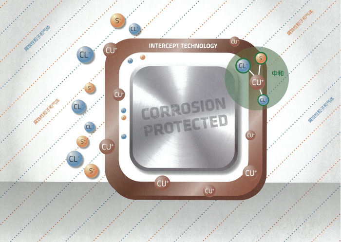 少量穿過INTERCEPTTM材料的水汽,由于其中所含的腐蝕性元素已在穿透過程中與銅粒子結(jié)合,故而消除了銹蝕的可能。