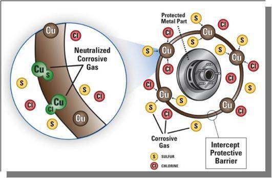INTERCEPT reacts with and permanently chemically binds the corrosive gases creating a neutralized atmosphere, which protects all of the materials inside against corrosion (rust, oxidation, solderability, etc.) and aging. Humidity, which can penetrate the packing material, will have its atmospheric corrosive gases neutralized and thus cannot cause corrosion. It therefore provides protection for metals and fabrics, and just about everything from an engine and intricate gears to silver jewelry.