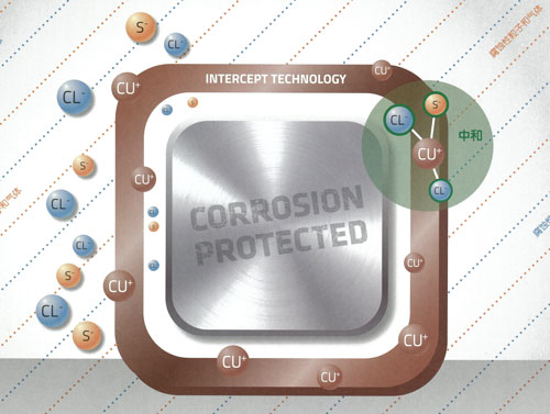 INTERCEPT? 產(chǎn)品是高表面積的銅離子融合到了塑料膜內(nèi),銅離子與大氣中的腐蝕性氣體元素時(shí)時(shí)反應(yīng),使被保護(hù)的物品周?chē)纬芍行詺鈱?。?jīng)過(guò)20多年的發(fā)展,INTERCEPT? 的防護(hù)效果已經(jīng)在各種應(yīng)用中得到驗(yàn)證,即使在腐蝕氣體含量高的地區(qū)和極端的溫濕度條件下,INTERCEPT 的防護(hù)效果仍能得到保障。